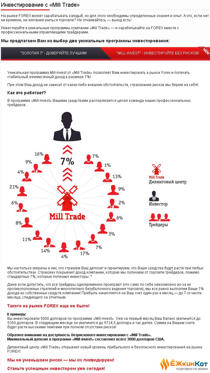 «Золотая 7» инвестиционная программа аналогичная Index Top 20 от FOREX MMCIS group, только здесь средства инвесторов распределяются между семеркой профессиональных трейдеров, а не между двадцаткой. Вход в золотую семерку менее демократичен – 300$. Большим плюсом является то, что начисление дохода за прошедший месяц производится до 7-го числа, а не до 10-го числа как в Index Top 20. Компания также как и FOREX MMCIS group от полученного инвесторами ежемесячного дохода берет комиссию в размере 15%. Средняя ежемесячная доходность по результатам работы «Золотая 7» за 2013 года составила 10,61% или 9,02% с учетом комиссии компании. Это, согласитесь, гораздо выше процента по банковским депозитам. Нетрудно подсчитать, что общая годовая доходность с учетом реинвестирования в 2013 году составила примерно 236%. К несомненному плюсу компании можно отнести то, что для ввода и вывода средств в инвестиционную программу существует множество способов: банковский перевод, банковские карты, киви кошелек, перфект мани, веб мани и т.д. Как правило, ввод средств, кроме банковского перевода осуществляется тут же. Вывод производится до 5 рабочих дней. Щедрая партнерская программа – еще один большой плюс Mill Trade: за лично приглашенных получаешь 7% от их дохода, за приглашенных второй линии получаешь 1-3% от их дохода в инвестиционных программах. В личном кабинете на сайте Mill Trade есть отдельный партнерский раздел, где присутствует и реферальная ссылка для привлечения новых клиентов и различные рекламные материалы – очень удобно в отличие от FOREX MMCIS group, где для полноценного участия в партнерской программе необходимо зарегистрироваться на специальном партнерском сайте.